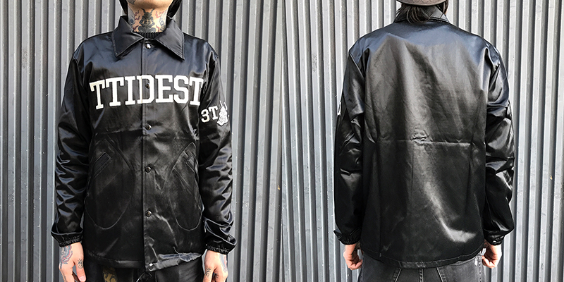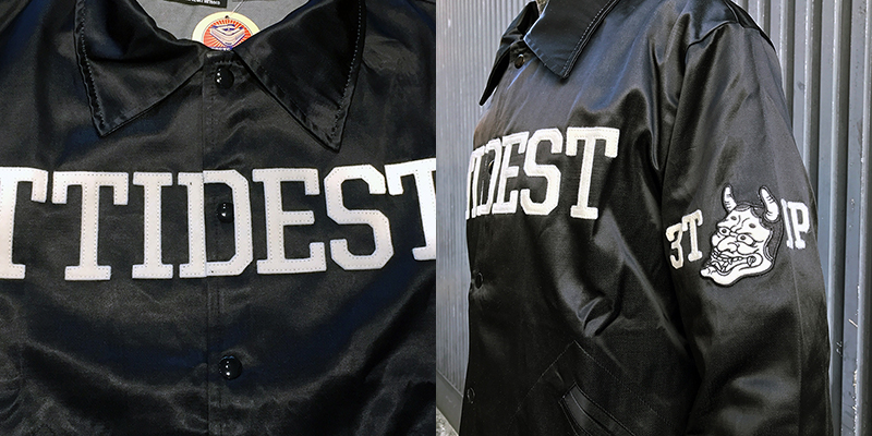 人気のヴィンテージサテンウインドブレーカーをベースに、フェルト生地の3TIDESロゴと般若のマークが
